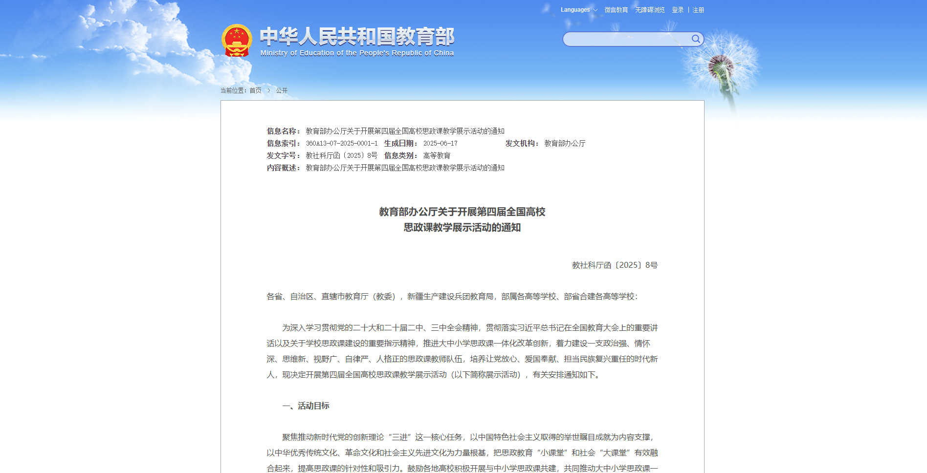 近日教育部網站發(fā)布《教育部辦公廳關于開展第四屆全國高校思政課教學展示活動的通知》其中提到,為深入學習貫徹黨的二十大和二十屆二中、三中全會精神,貫徹落實習近平總書記在全國教育大會上的重要講話以及關于學校思政課建設的重要指示精神,推進大中小學思政課一體化改革創(chuàng)新,著力建設一支政治強、情懷深、思維新、視野廣、自律嚴、人格正的思政課教師隊伍,培養(yǎng)讓黨放心、愛國奉獻、擔當民族復興重任的時代新人,現(xiàn)決定開展第四屆全國高校思政課教學展示活動(以下簡稱展示活動)。