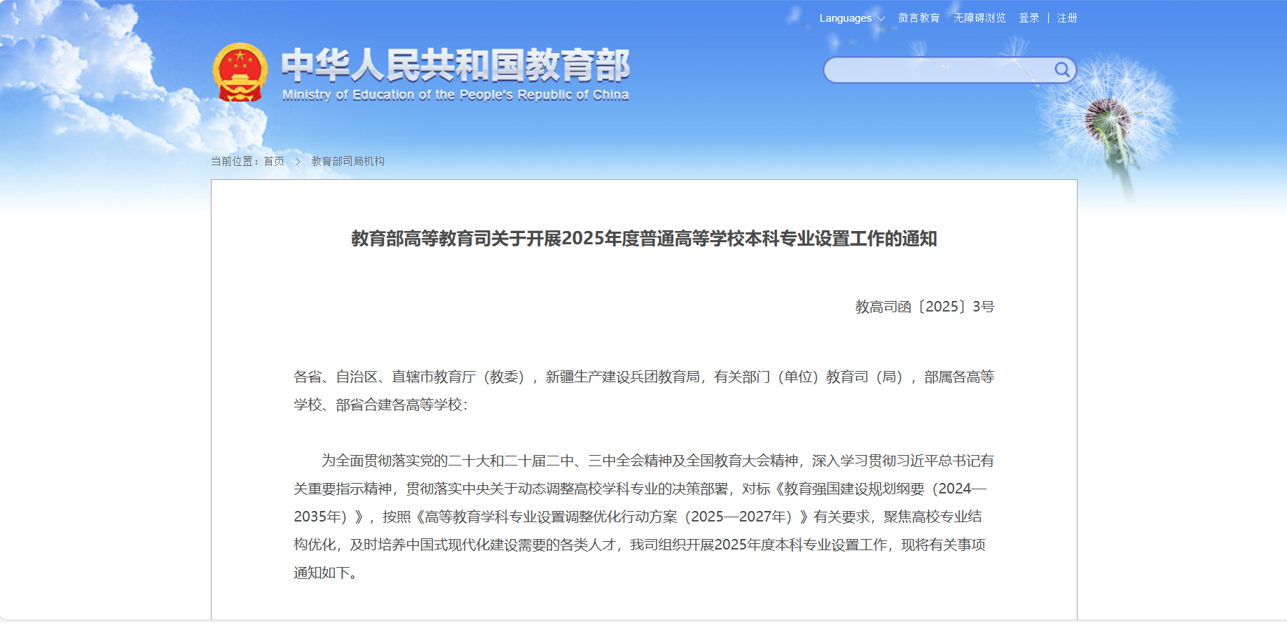 為全面貫徹落實黨的二十大和二十屆二中、三中全會精神及全國教育大會精神,深入學習貫徹習近平總書記有關重要指示精神,貫徹落實中央關于動態(tài)調整高校學科專業(yè)的決策部署,對標《教育強國建設規(guī)劃綱要(2024—2035年)》,按照《高等教育學科專業(yè)設置調整優(yōu)化行動方案(2025—2027年)》有關要求,聚焦高校專業(yè)結構優(yōu)化,及時培養(yǎng)中國式現(xiàn)代化建設需要的各類人才,我司組織開展2025年度本科專業(yè)設置工作,現(xiàn)將有關事項通知如下。