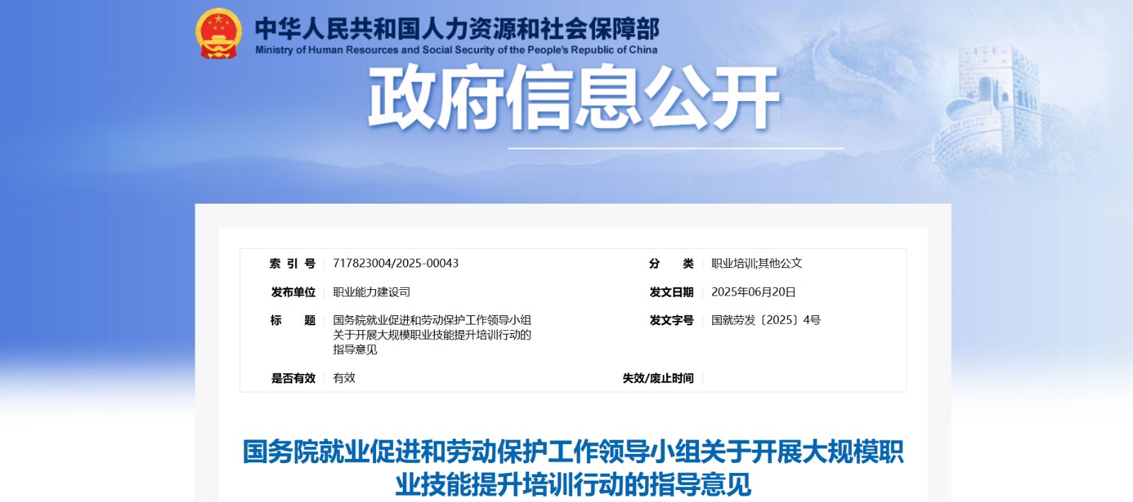 為應(yīng)對挑戰(zhàn)、擴(kuò)大內(nèi)需、促進(jìn)高質(zhì)量就業(yè)、助力勞動者提技增收,國務(wù)院就業(yè)促進(jìn)和勞動保護(hù)工作領(lǐng)導(dǎo)小組正式印發(fā)《關(guān)于開展大規(guī)模職業(yè)技能提升培訓(xùn)行動的指導(dǎo)意見》(國就勞發(fā)〔2025〕4號)。